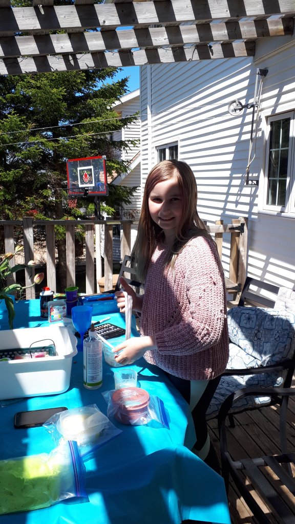 Frances opened some gifts, mostly for slime, then we did a treasure hunt by the creek. She will get to see Tori for the first time today.